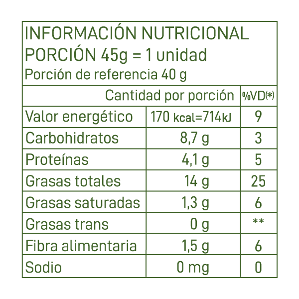 Sin gluten, sin azúcar agregada, sin sal, sin cereales, sin aditivos ni conservantes, sin aceites ni grasas hidrogenadas, sin ingredientes lácteos, sin maní, sin huevo, gran fuente de fibras y 100 % veganos.