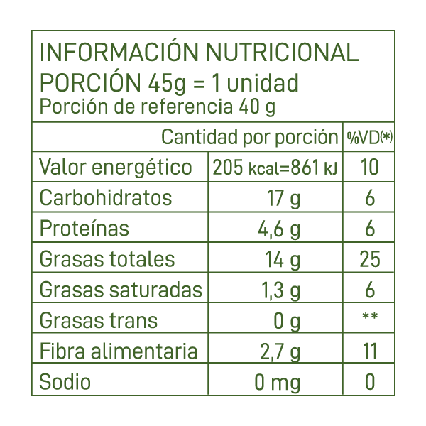 Sin gluten, sin azúcar agregada, sin sal, sin cereales, sin aditivos ni conservantes, sin aceites ni grasas hidrogenadas, sin ingredientes lácteos, sin maní, sin huevo, gran fuente de fibras y 100 % veganos.