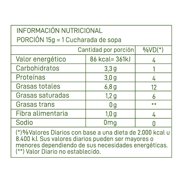 Sin gluten, sin azúcar agregada, sin sal, sin cereales, sin aditivos ni conservantes, sin aceites ni grasas hidrogenadas, sin ingredientes lácteos, sin maní, sin huevo, gran fuente de fibras y 100 % veganos.
