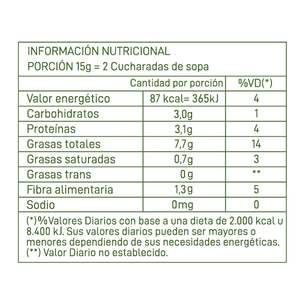 Sin gluten, sin azúcar agregada, sin sal, sin cereales, sin aditivos ni conservantes, sin aceites ni grasas hidrogenadas, sin ingredientes lácteos, sin maní, sin huevo, gran fuente de fibras y 100 % veganos.