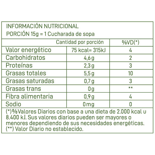 Sin gluten, sin azúcar agregada, sin sal, sin cereales, sin aditivos ni conservantes, sin aceites ni grasas hidrogenadas, sin ingredientes lácteos, sin maní, sin huevo, gran fuente de fibras y 100 % veganos.
