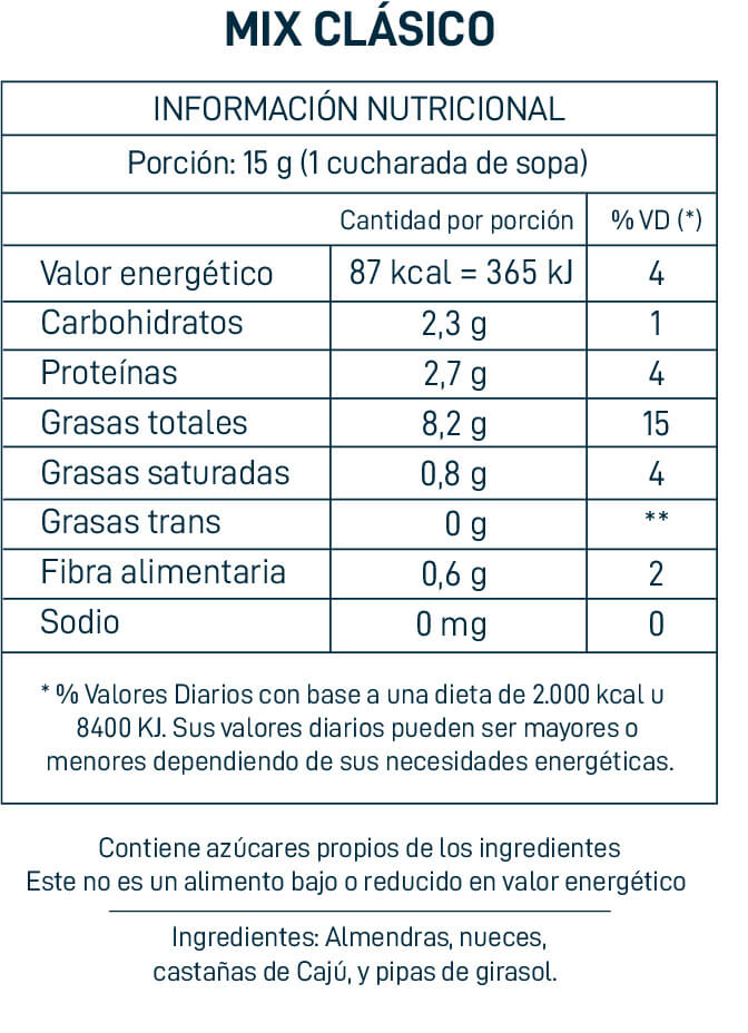 Sin gluten, sin azúcar agregada, sin sal, sin cereales, sin aditivos ni conservantes, sin aceites ni grasas hidrogenadas, sin ingredientes lácteos, sin maní, sin huevo, gran fuente de fibras y 100 % vegano.